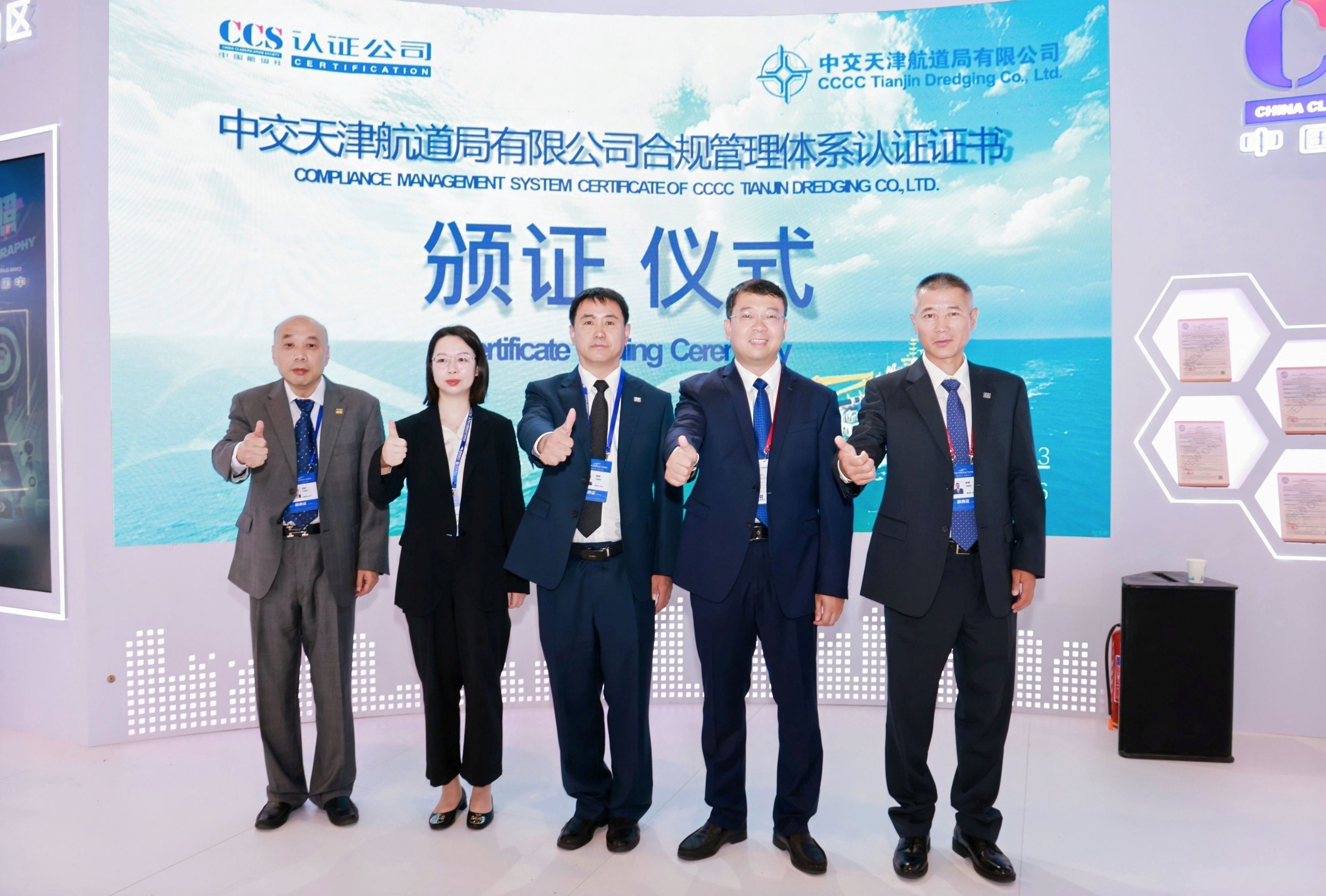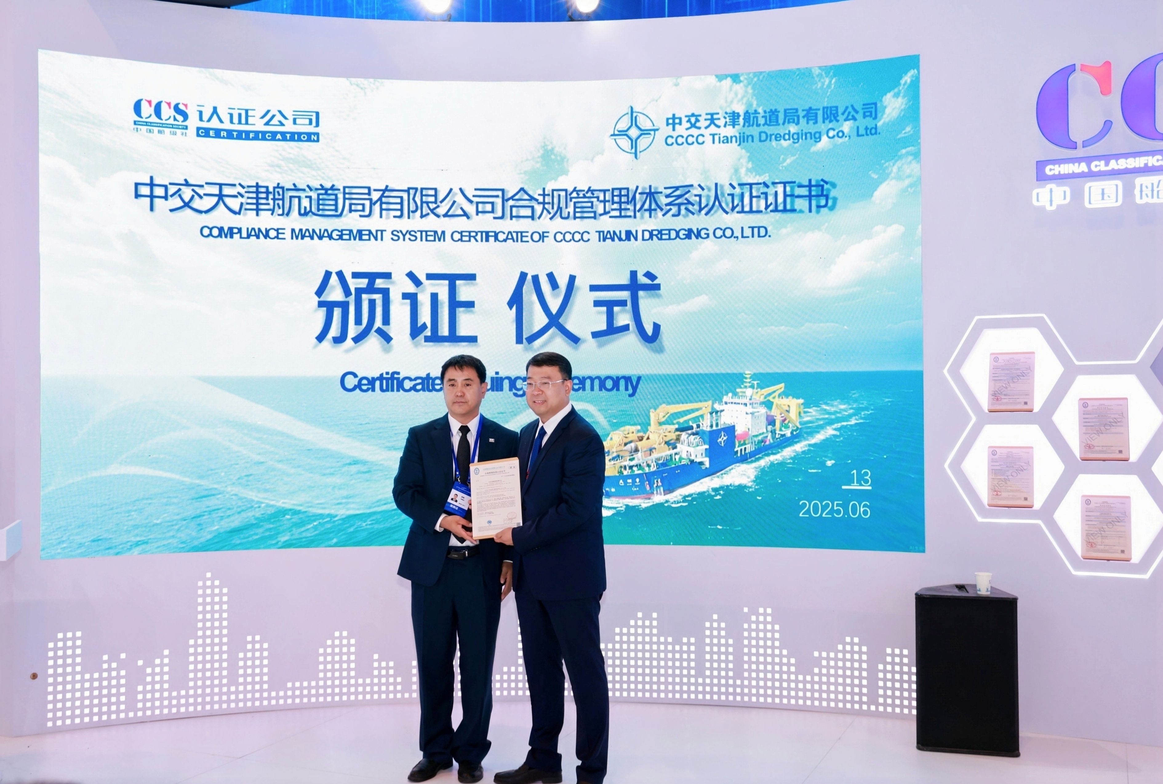在第三届国际航运展"航通天下·运行未来"的浪潮中,在第十八个"世界认可日"的活动背景下,一场聚焦央企合规管理的盛会于6月13日在天津国际航运展U9馆中国船级社展区隆重召开。中交天津航道局有限公司(以下简称"天航局")正式获颁中国船级社质量认证有限公司《合规管理体系认证证书》,标志着其成为中交集团系统内首家通过该项认证的企业。公司党委书记、董事长田伟、天航局党委副书记毛昌锋等领导共同见证这一深化企业治理、赋能行业高质量发展的里程碑时刻。