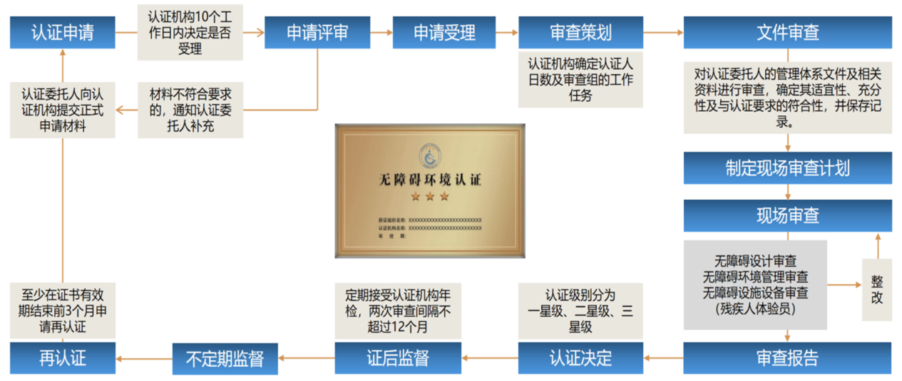 无障碍环境认证是指对公共场所、建筑设施等进行评估,确保其符合无障碍设计标准,为残疾人、老年人、孕妇等特殊群体提供便利的生活环境。通过认证的环境将获得相应的证书和标识,以证明其具备无障碍功能。无障碍环境认证模式包括:无障碍设计审查+无障碍环境管理审查+无障碍设施设备审查+证后监督。