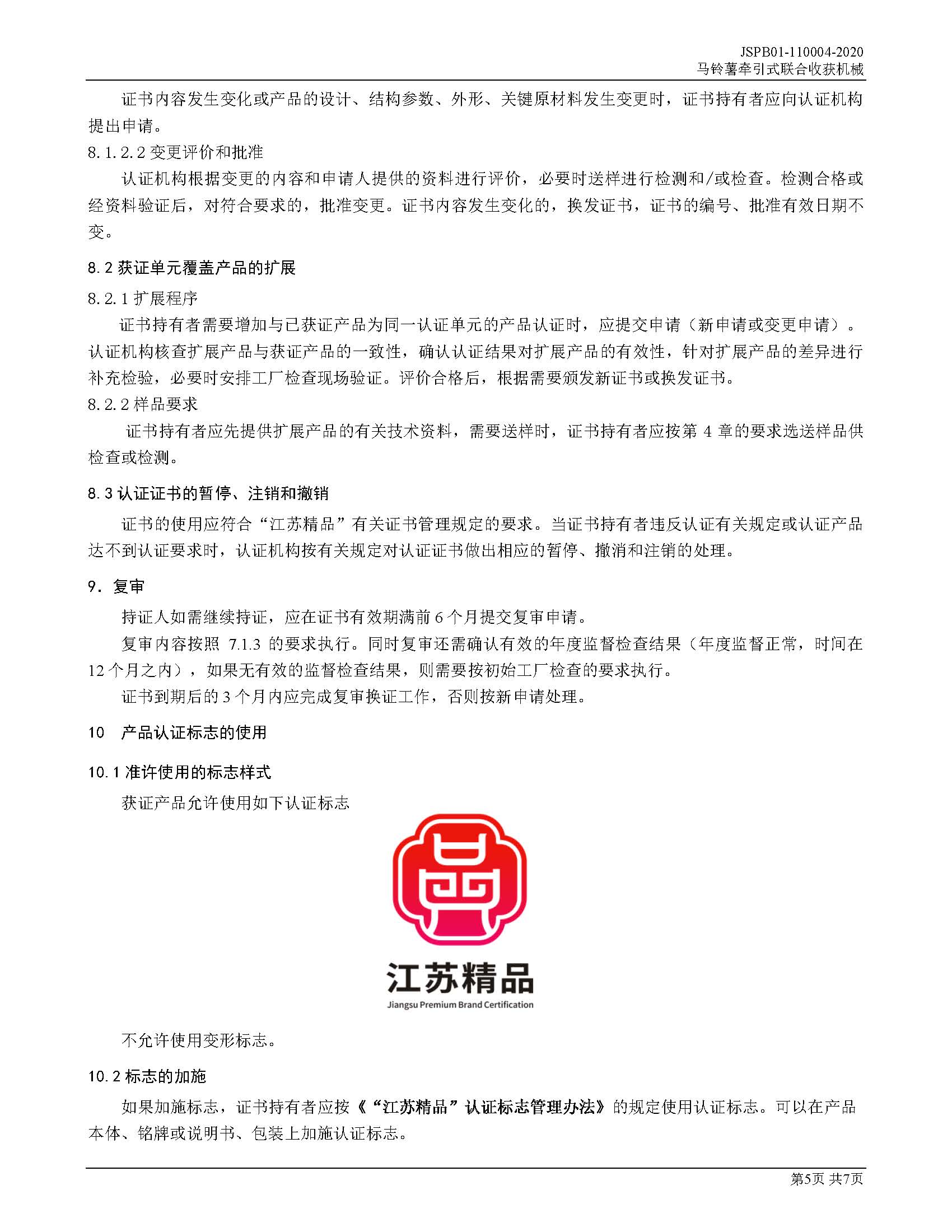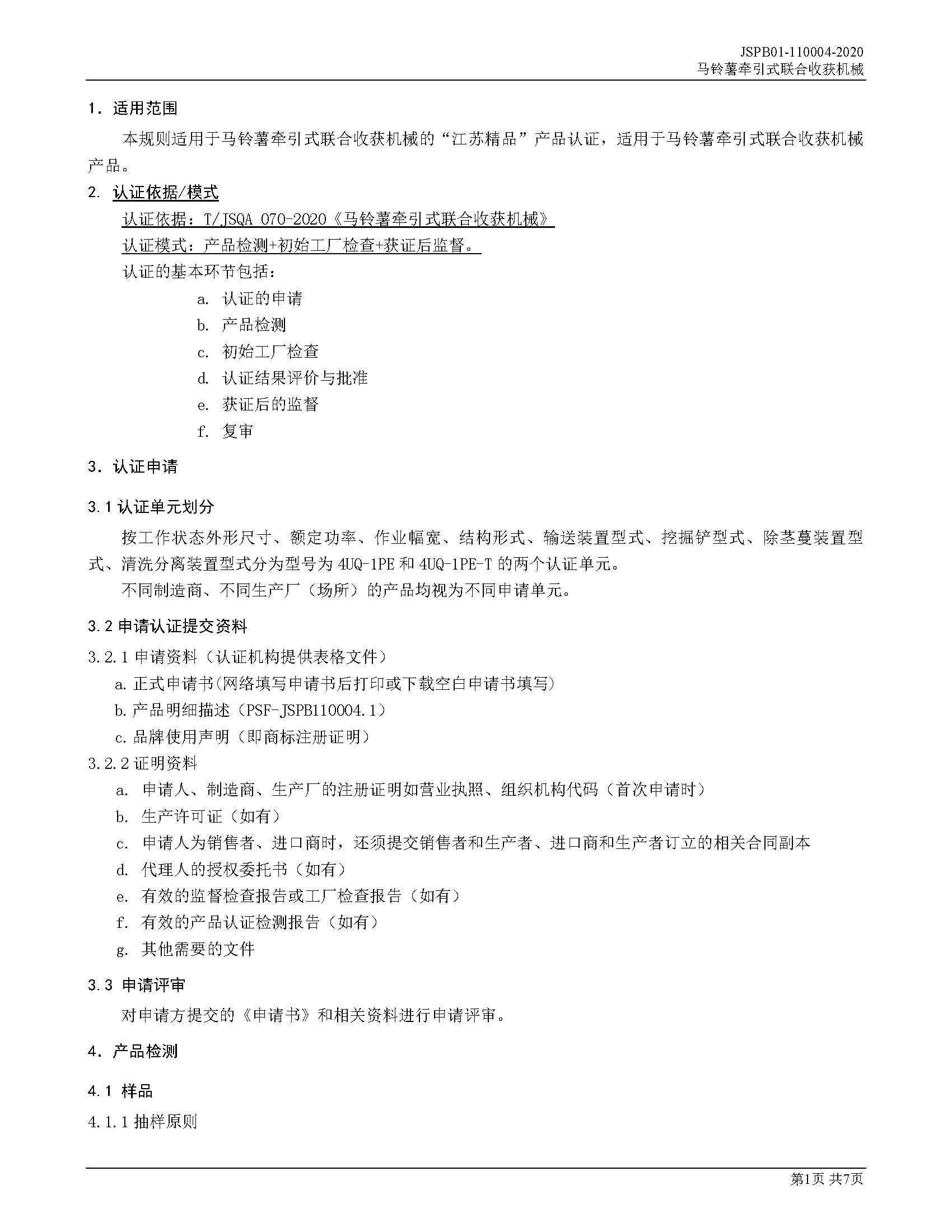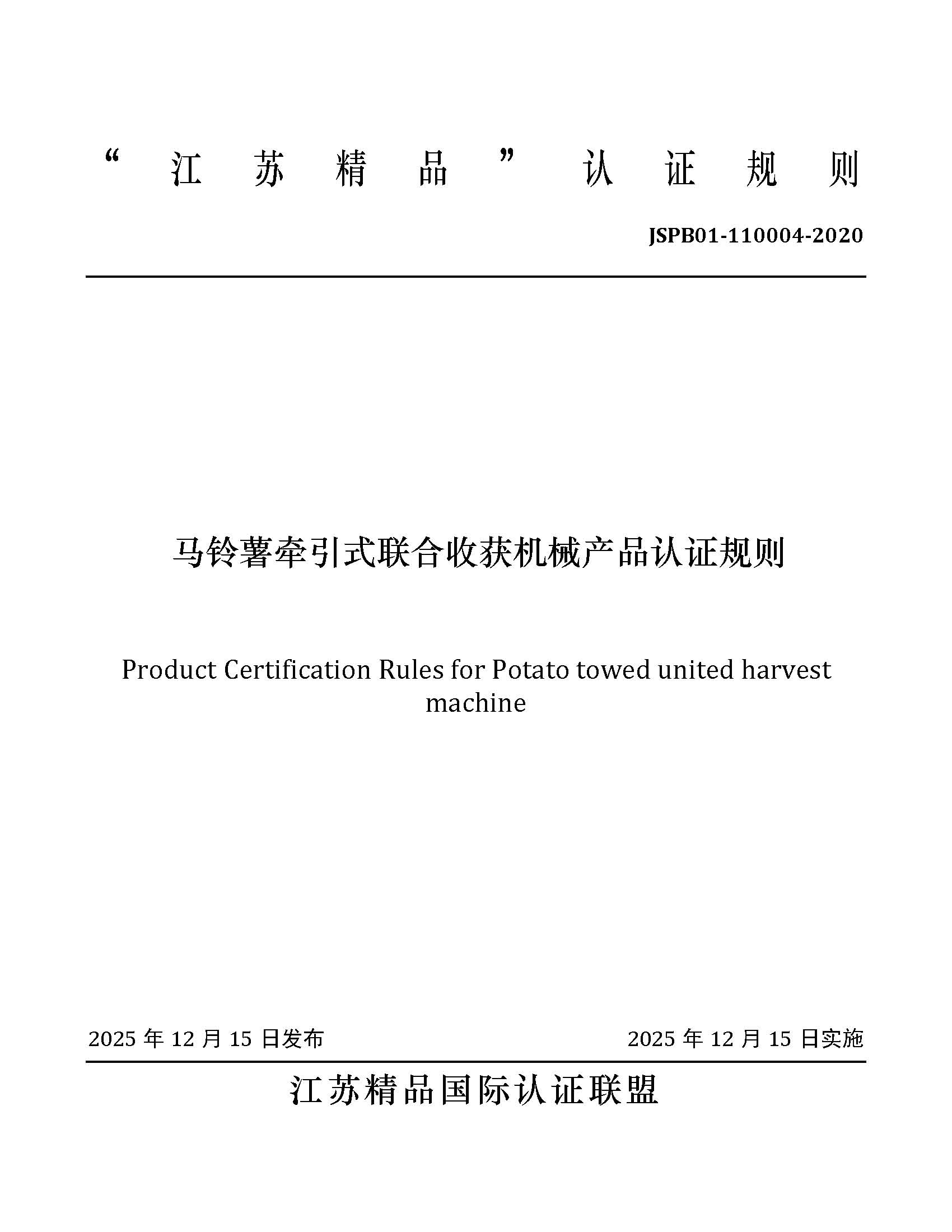 JSPB01-110004-2020马铃薯牵引式联合收获机械产品认证规则