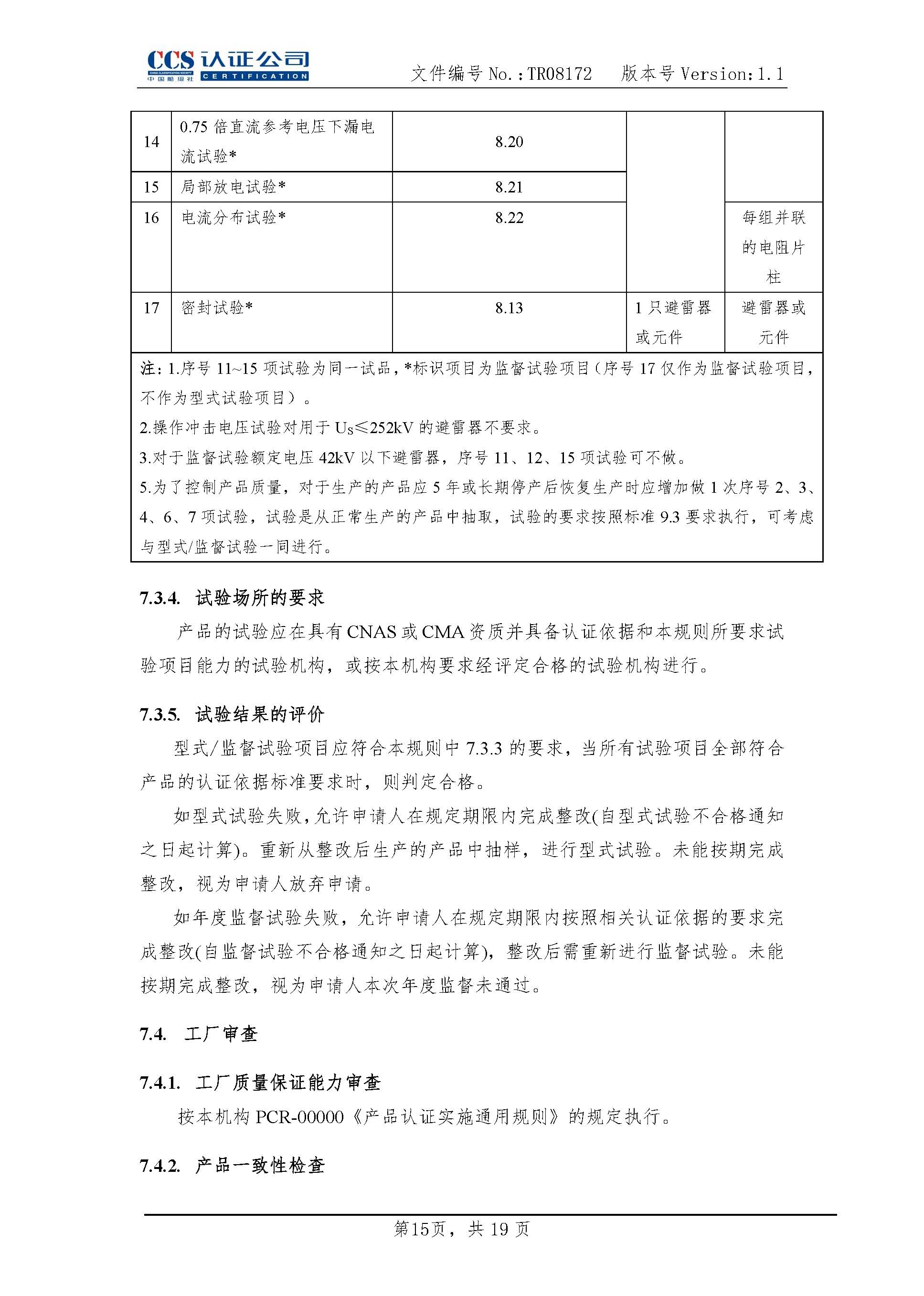 TR08172-1.1 交流无间隙金属氧化物避雷器产品认证实施专用规则