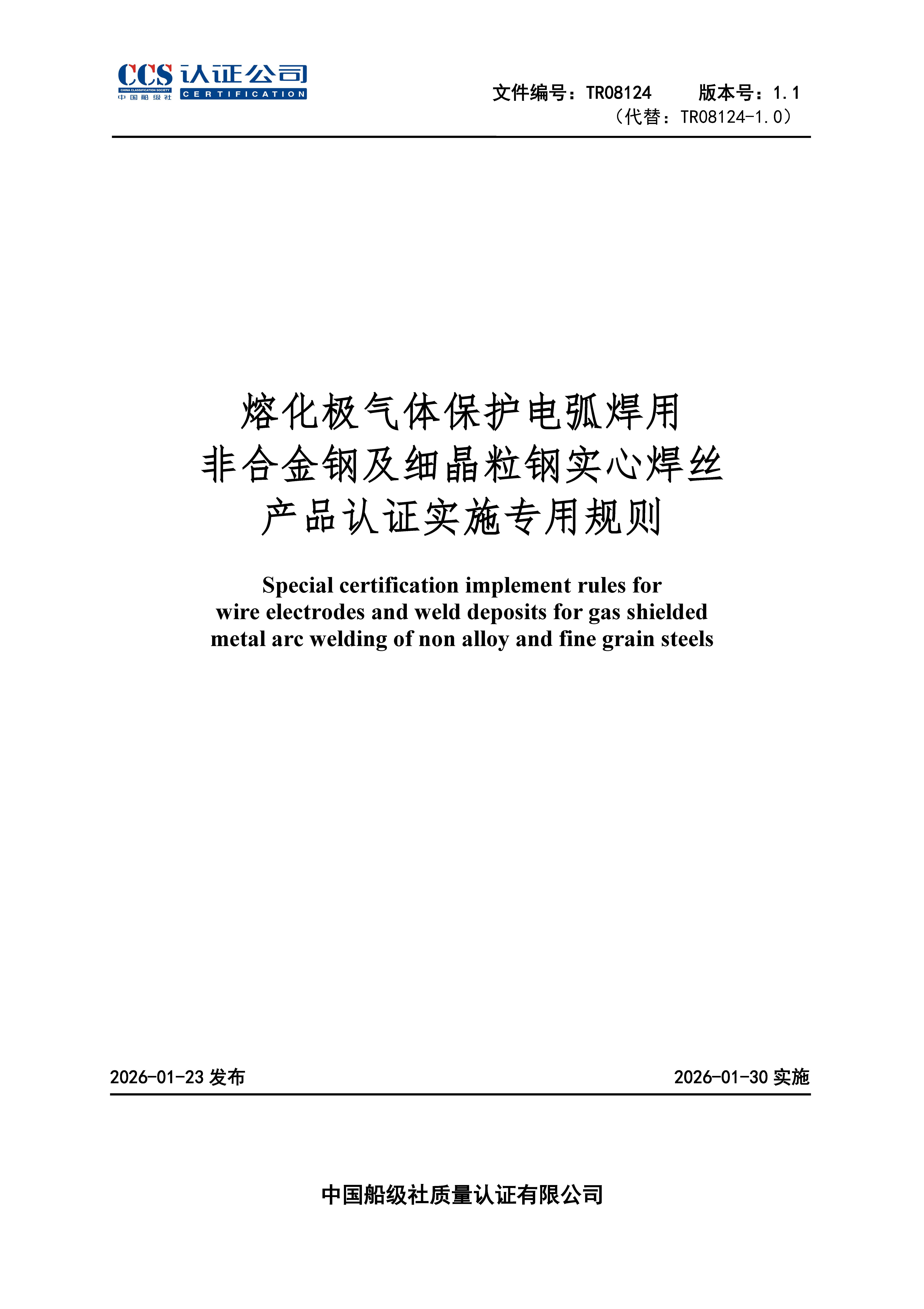 TR08124-1.1 熔化极气体保护电弧焊用非合金钢及细晶粒钢实心焊丝产品认证实施专用规则