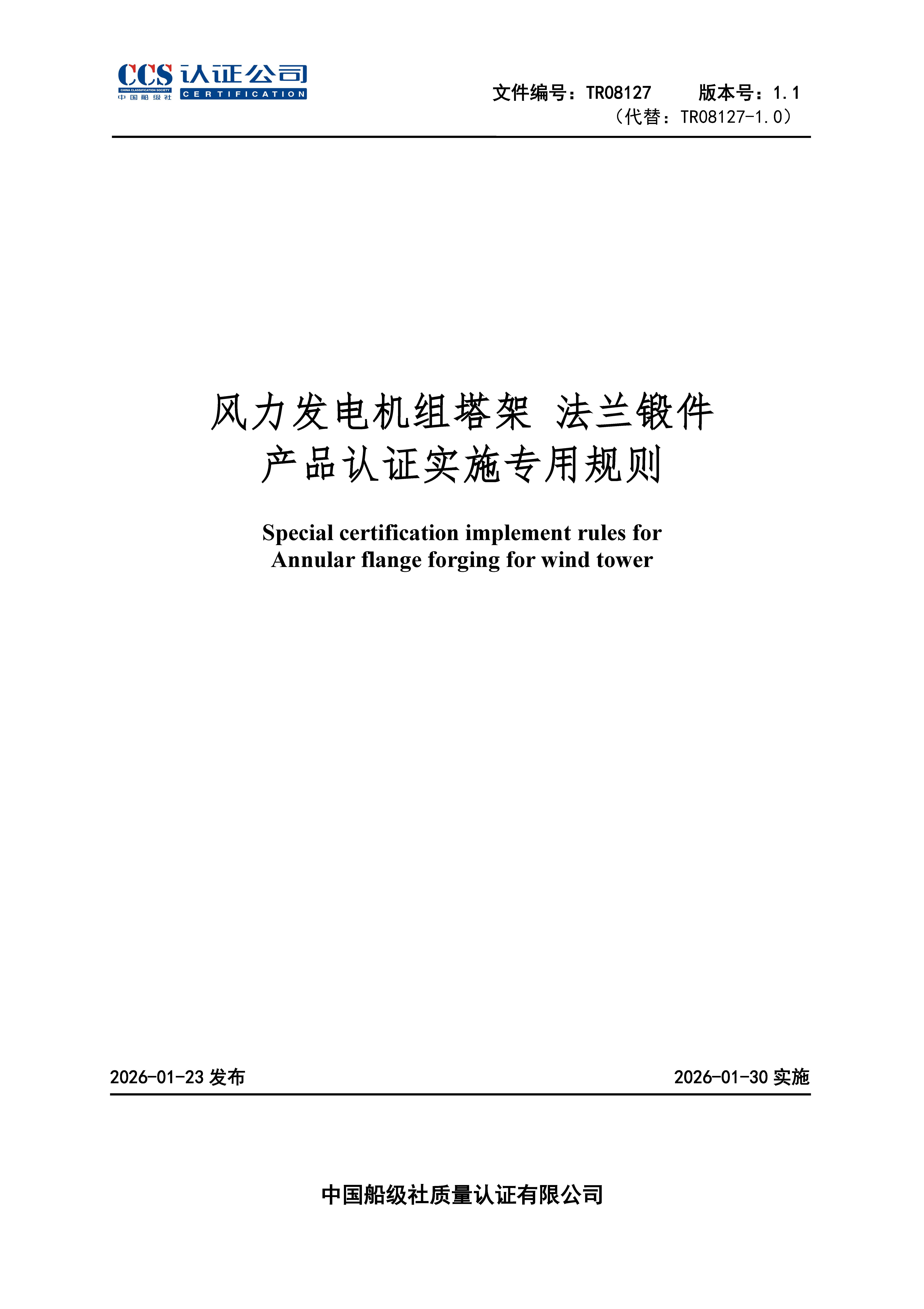 TR08127-1.1 风力发电机组 塔架法兰锻件产品认证实施专用规则