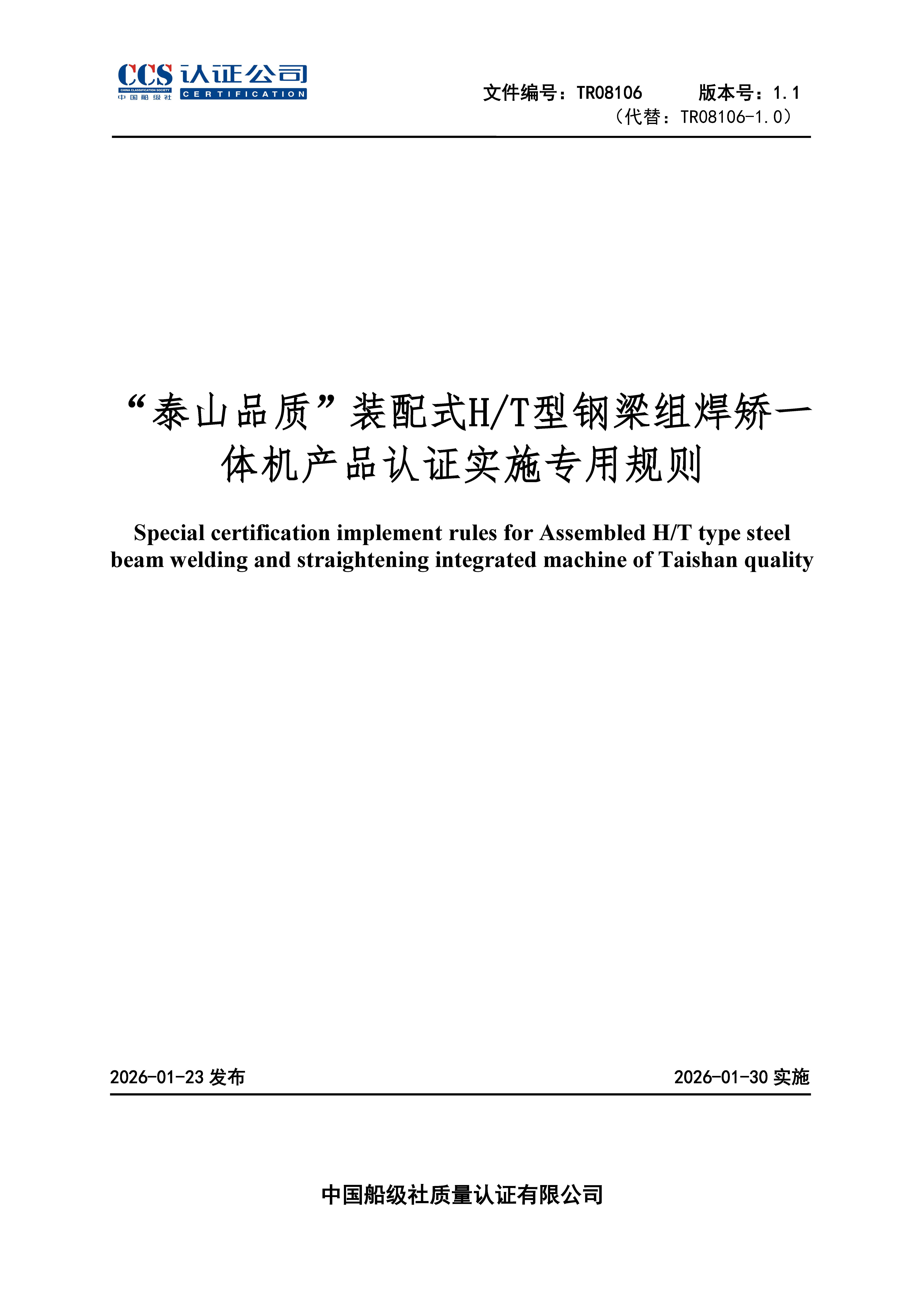 TR08106-1.1 “泰山品质”装配式HT型钢梁组焊矫一体机产品认证实施专用规则