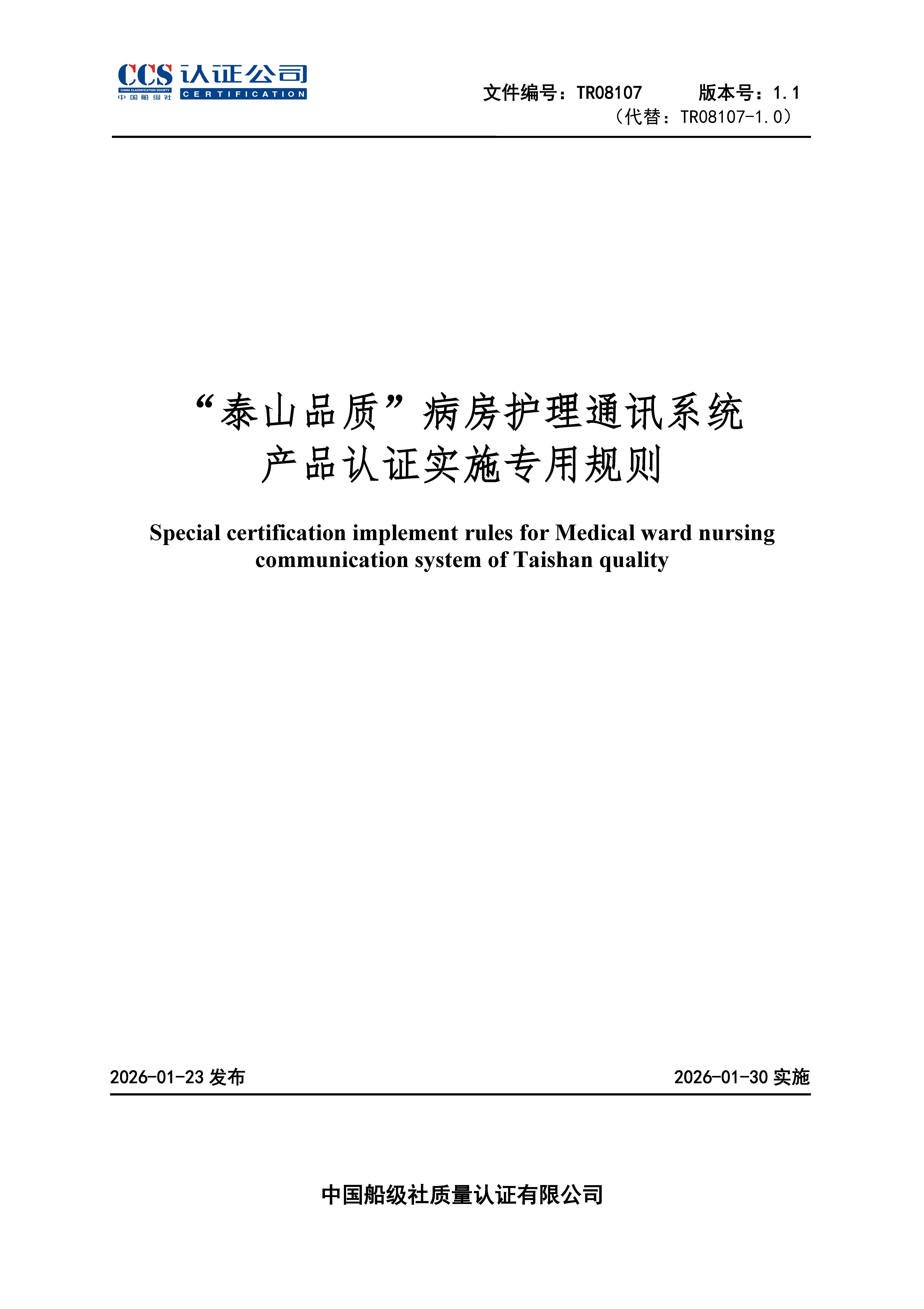 TR08107-1.1 “泰山品质”病房护理通讯系统产品认证实施专用规则