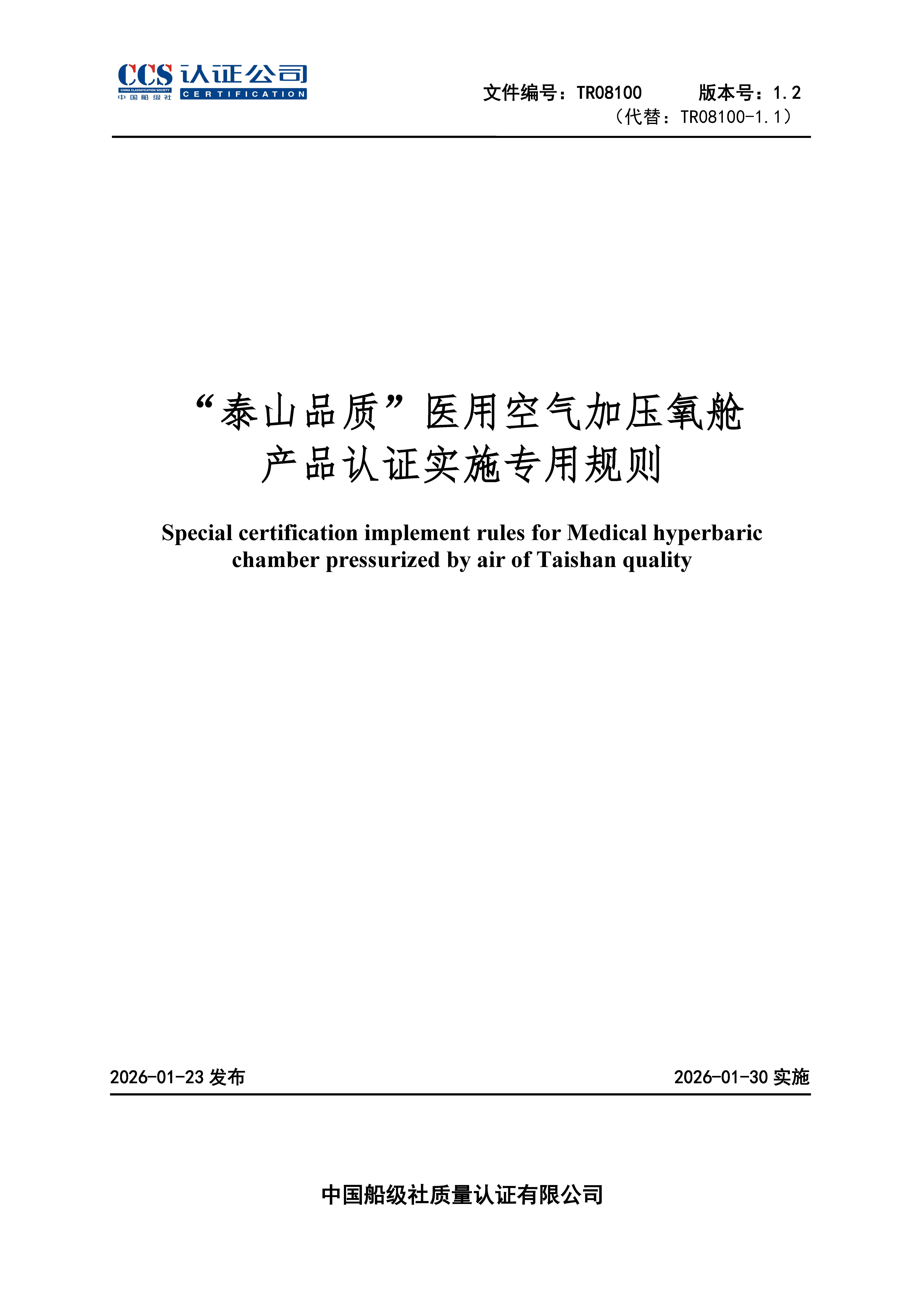 TR08100-1.2 “泰山品质”医用空气加压氧舱产品认证实施专用规则