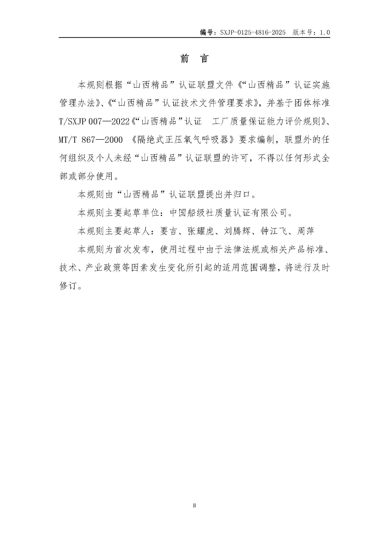 SXJP-0125-4816-2025“山西精品”认证实施规则隔绝式正压氧气呼吸器